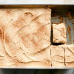 - Heat oven to 350 degrees. Butter a 9-by-13-inch baking pan. In a medium bowl, whisk together the flour, 3/4 cup/150 grams sugar, the baking powder, cinnamon, nutmeg and 1/4 teaspoon salt. In a large bowl, whisk together the egg yolks, melted butter, milk and vanilla.